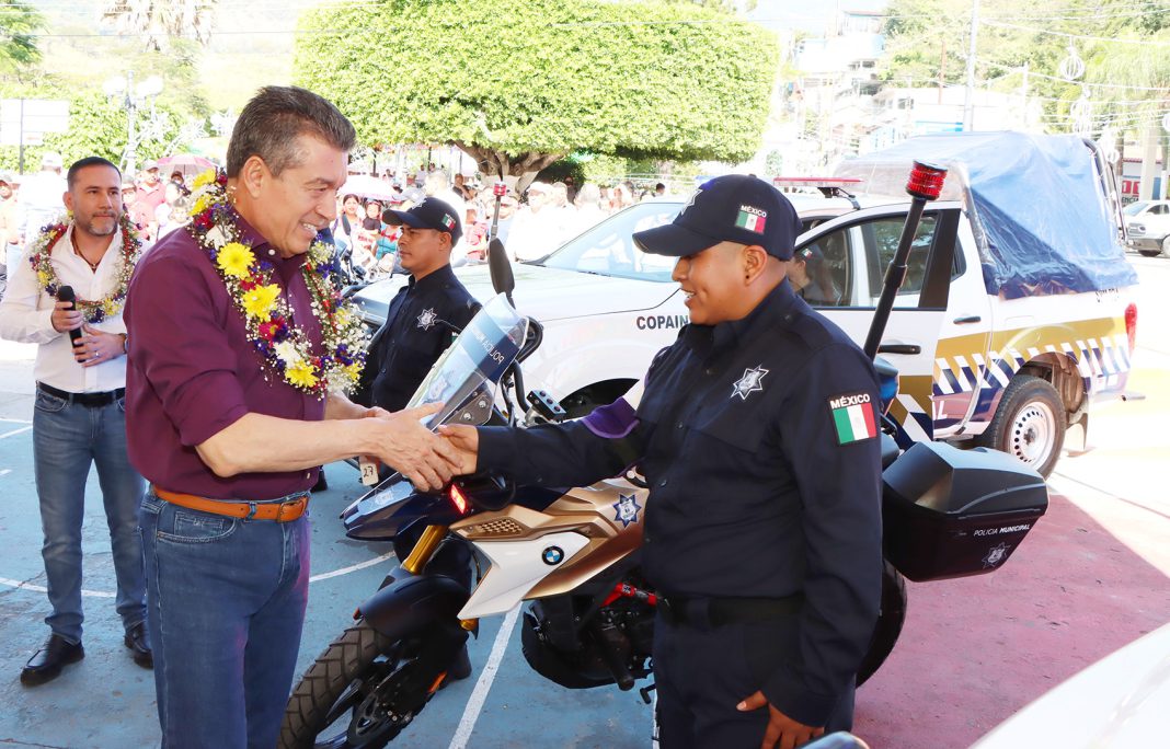 En Copainalá, el gobernador Rutilio Escandón Cadenas entregó equipamiento, becas, patrullas y motopatrullas a la Policía Municipal, con la finalidad de fortalecer la labor de quienes están a cargo de resguardar la seguridad de la población y su patrimonio.