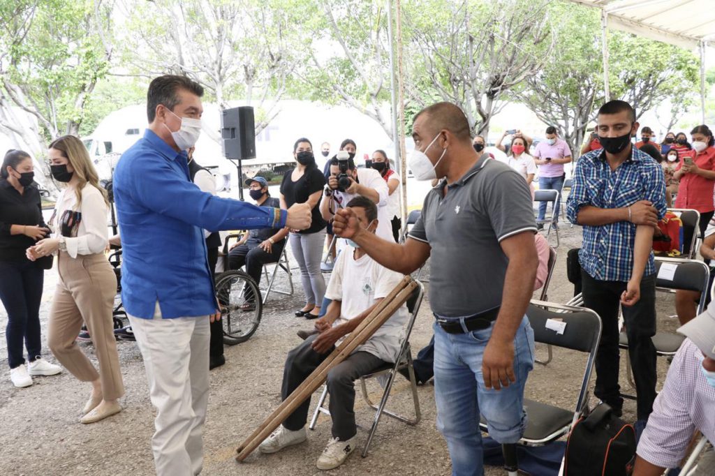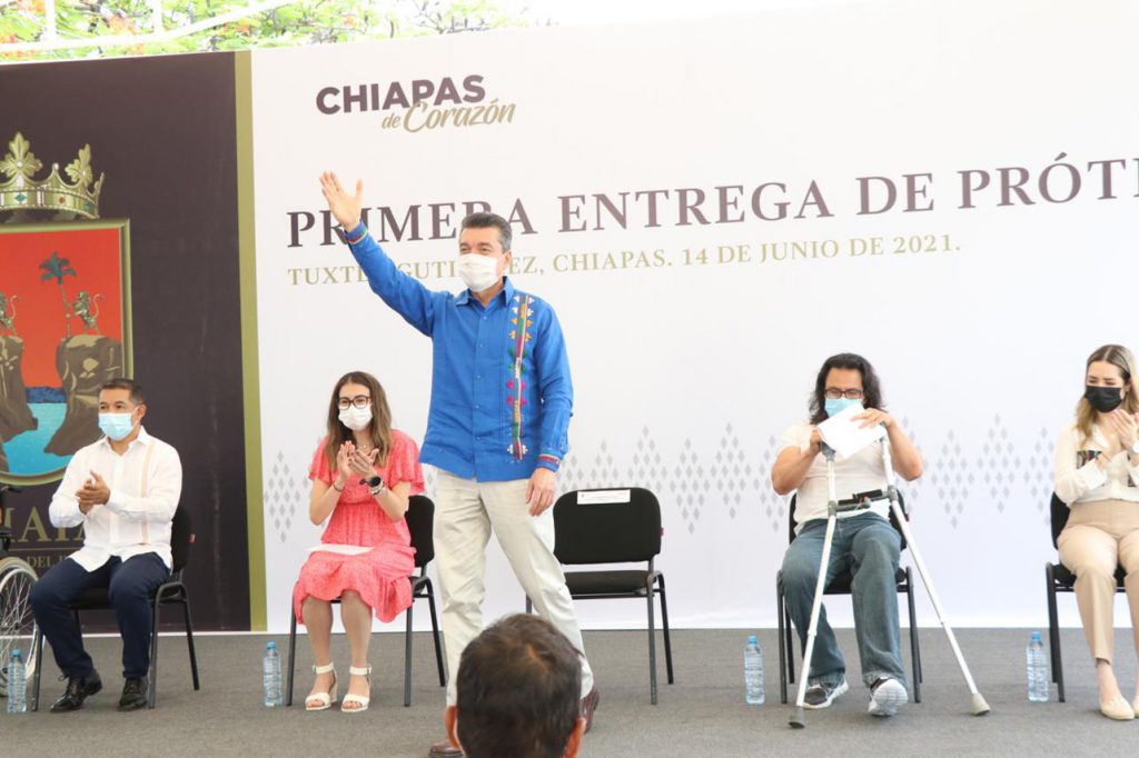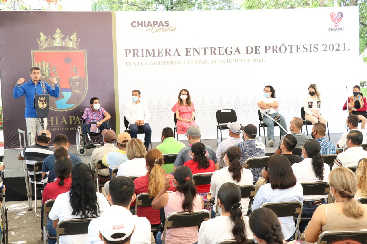 Al encabezar la Primera Entrega de Prótesis 2021, que beneficia a la población que padece alguna discapacidad de miembro superior o inferior, el gobernador Rutilio Escandón Cadenas subrayó que este gobierno trabaja de manera decidida para elevar la calidad de vida de quienes se encuentran en situación de mayor vulnerabilidad, a fin de acabar con la desigualdad, discriminación y exclusión, y transitar hacia un Chiapas más equitativo, justo e incluyente.