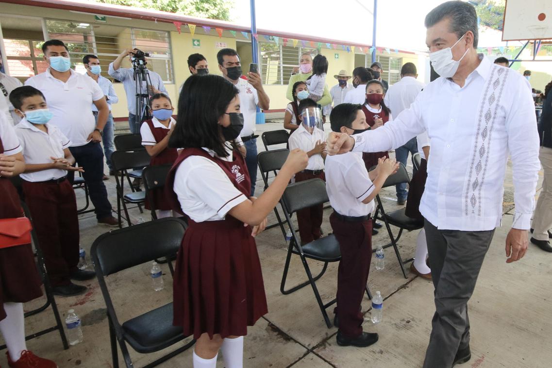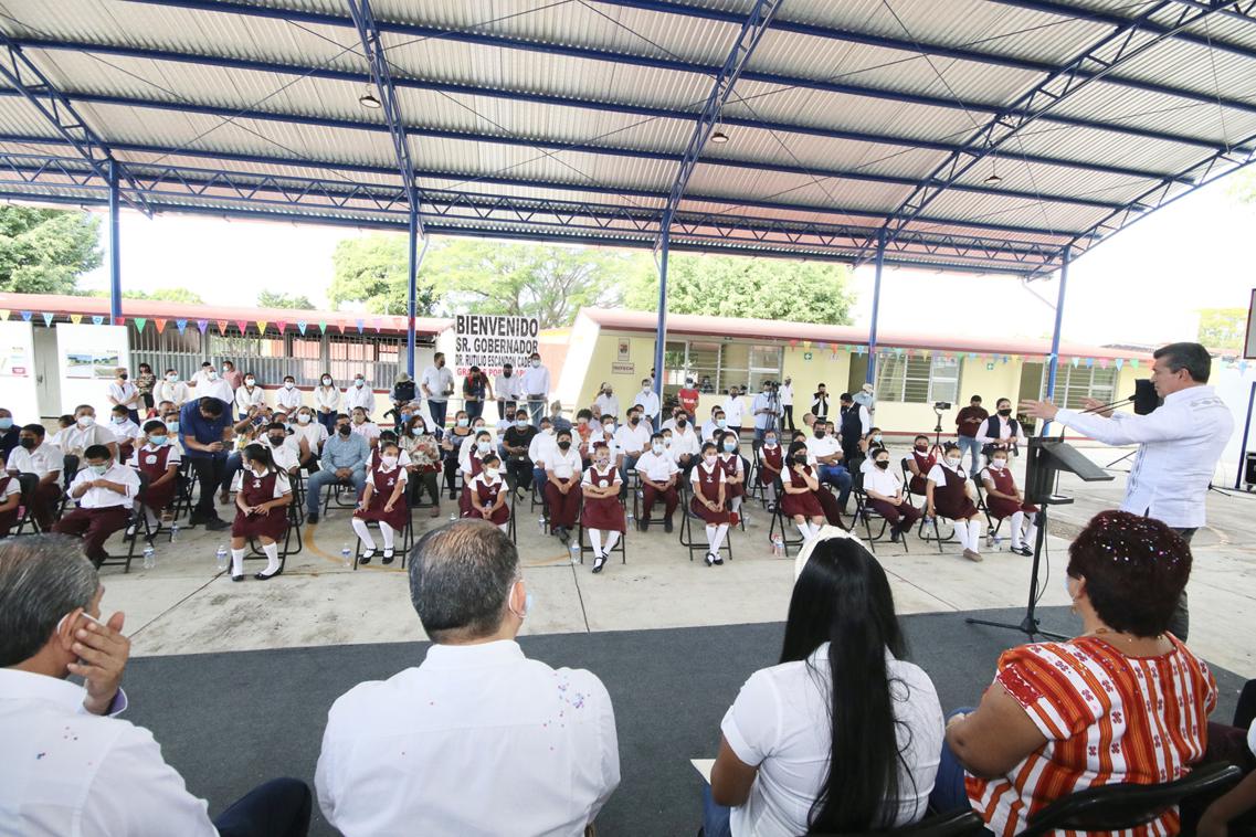 Luego de recorrer las aulas didácticas y constatar que cuentan con el mobiliario escolar correspondiente, el mandatario subrayó que estas acciones son parte de la gran responsabilidad de este gobierno democrático que trabaja para todas y todos, sin ninguna distinción y que el recurso público lo invierte en más y mejores espacios que faciliten el proceso de enseñanza-aprendizaje.
