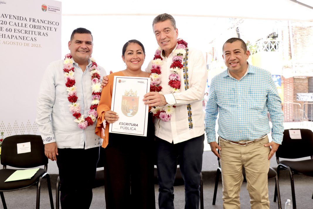 El gobernador Rutilio Escandón Cadenas inauguró la modernización de la Avenida Francisco Sarabia y entregó 60 escrituras públicas a familias de la colonia “Juan Sabines” en el municipio de Mapastepec, quienes resultaron damnificadas por el huracán Stan y hoy, después de 18 años de espera, reciben estos documentos que dan certeza de su patrimonio.