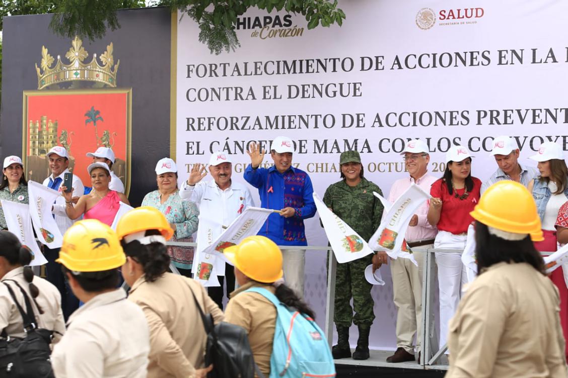 “La clave para combatir y erradicar diversos padecimientos es la prevención; por ello, me da gusto constatar que la salud en Chiapas se está atendiendo, al enfocar la atención en dos asuntos importantes: el combate al cáncer de mama y al dengue, zika y chikungunya. Es fundamental que participemos activamente en este tipo de acciones, revisarse permanentemente y acercarse a la unidad médica más cercana para atender cualquier indicio, aunque no tengamos ningún malestar”, apuntó.