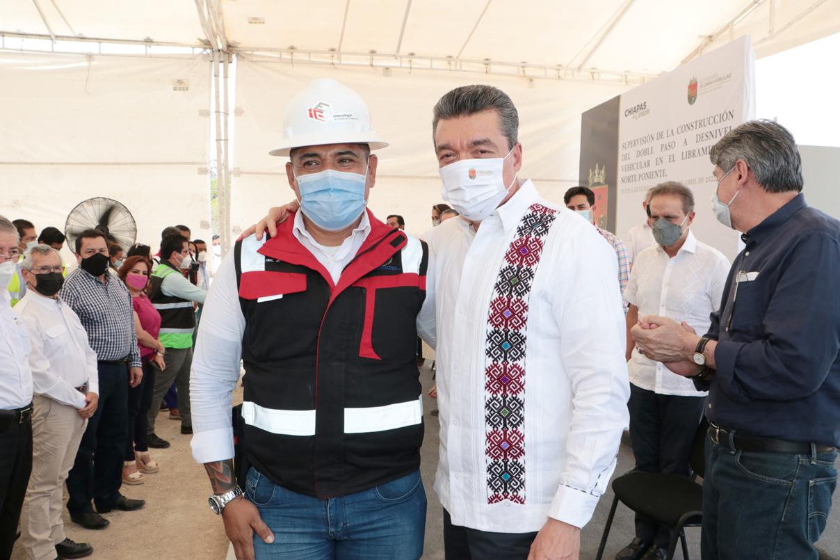 El gobernador Rutilio Escandón Cadenas encabezó la supervisión del doble Paso a Desnivel Vehicular del Libramiento Norte Poniente en las intersecciones con el Boulevard Juan Crispín y Boulevard Los Laguitos, donde destacó que, además de mejorar la movilidad vehicular y la imagen urbana, esta obra de alto impacto social fortalecerá la economía y contribuirá al progreso de Tuxtla Gutiérrez y de los municipios que conforman la región Metropolitana.