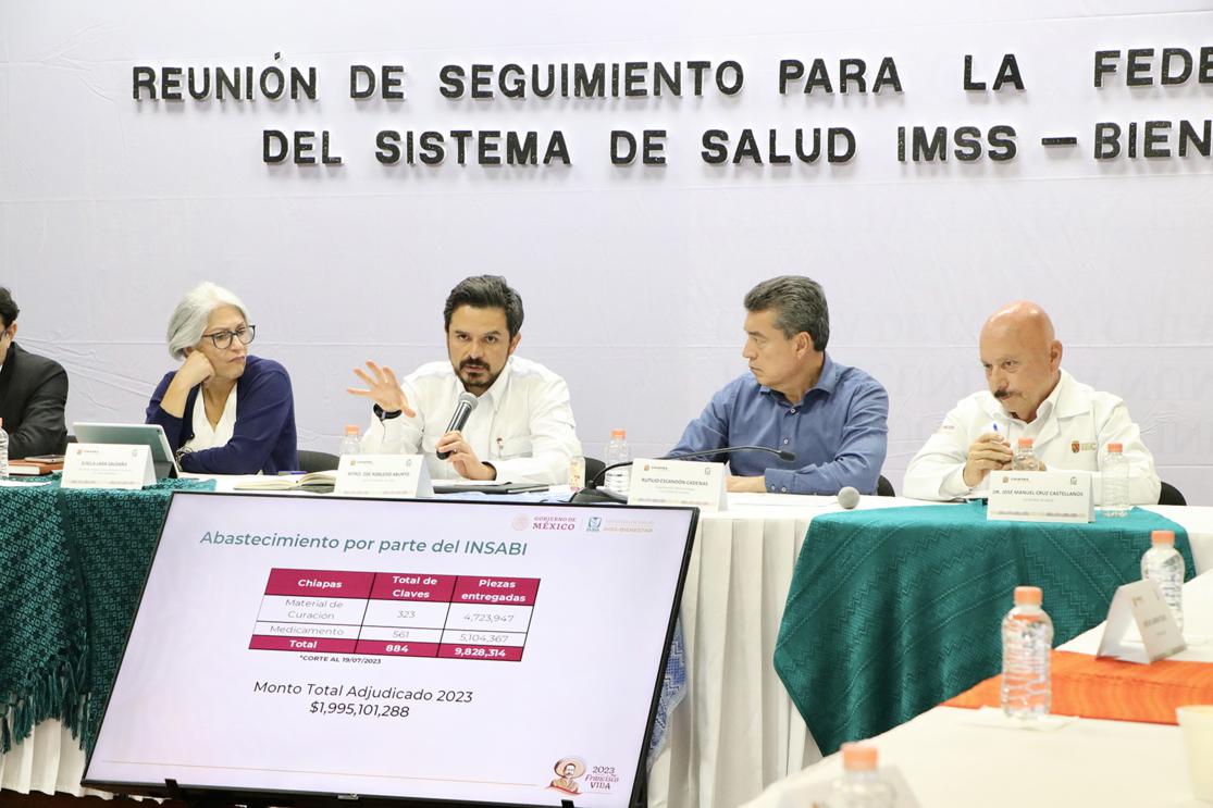 El responsable de Implementación del IMSS-Bienestar en Chiapas, Saúl Madrid Tovilla, destacó que mediante el Instituto de Salud para el Bienestar (Insabi) se han beneficiado 40 unidades médicas con más de 331 equipos médicos y ambulancias, y abastecido con 884 claves, lo que representa más de 9 millones de piezas de medicamentos y material de curación.