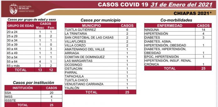 Tuxtla Gutiérrez, Chiapas; 31 de enero de 2021.- Chiapas cierra el primer mes del año con 479 casos positivos y 71 defunciones de COVID-19.