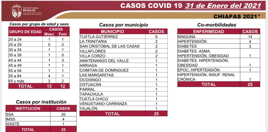 La distribución de los casos nuevos es la siguiente: Tuxtla Gutiérrez, seis; La Trinitaria, San Cristóbal de Las Casas, Villaflores y Villa Corzo, dos cada uno; y Amatenango del Valle, Arriaga, Comitán, Las Margaritas, Ocosingo, Ostuacán, El Parral, Tapachula, Tuxtla Chico, Venustiano Carranza y Yajalón, un caso cada municipio.
