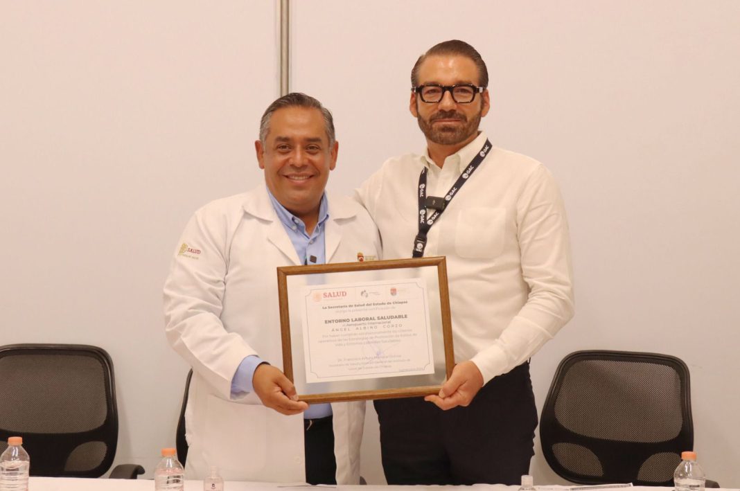 Chiapas de Corzo, Chiapas; 04 de septiembre de 2024.- El secretario de Salud del estado, Francisco Arturo Mariscal Ochoa, hizo entrega al director general del Aeropuerto Internacional “Ángel Albino Corzo”, Antonio Noguera Zurita, del certificado que acredita a esta terminal aérea como entorno laboral saludable, tras haber cumplido los criterios operativos de dicho programa, favoreciendo la salud de trabajadores y viajeros a través de la adopción de medidas preventivas para evitar la propagación de enfermedades.