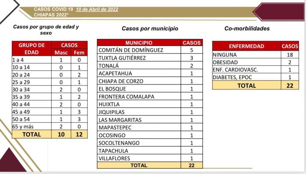 Tuxtla Gutiérrez, Chiapas; 10 de abril de 2022.- La Secretaría de Salud de Chiapas comunica el reporte de 22 casos positivos de COVID-19 en 15 municipios de la entidad, en las últimas horas.