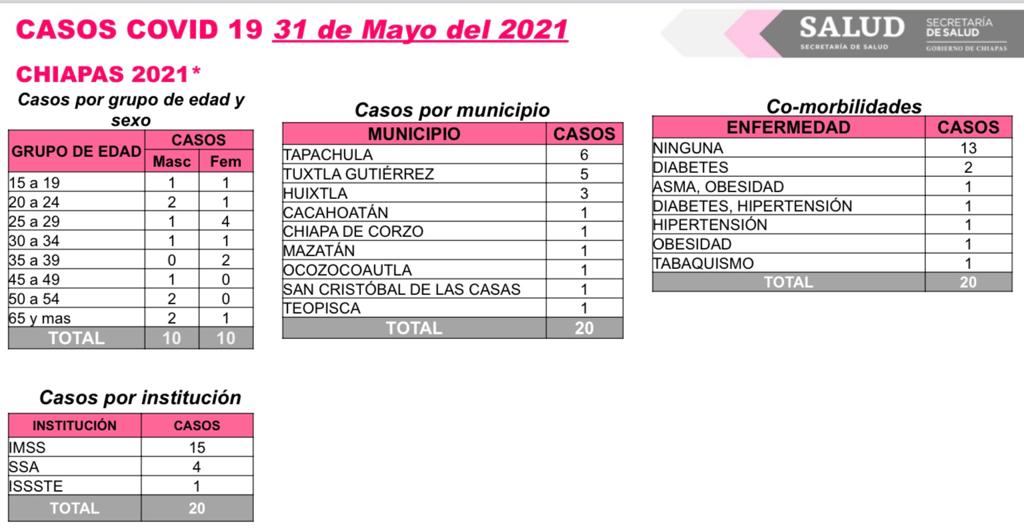 Los contagios nuevos se registraron de la siguiente manera: Tapachula, seis; Tuxtla Gutiérrez, cinco; Huixtla, tres; y Cacahoatán, Chiapa de Corzo, Mazatán, Ocozocoautla, San Cristóbal de Las Casas y Teopisca, un caso cada municipio.