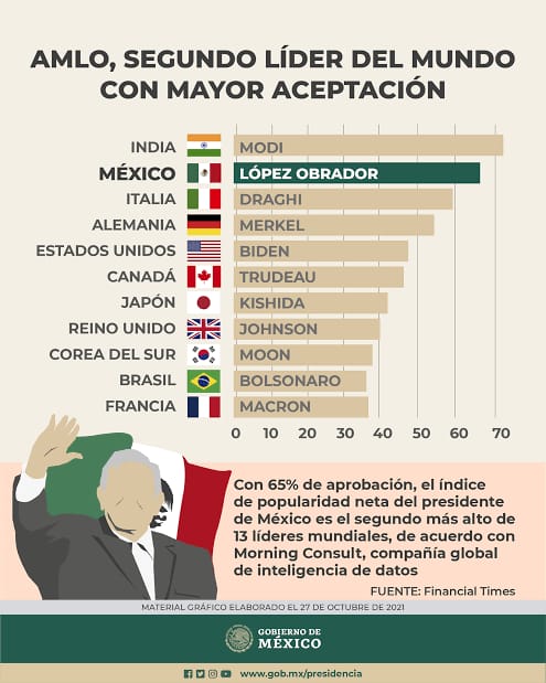 Según datos proporcionados por Morning Consult, el mandatario mexicano se ubica en segundo lugar, con un 65 por ciento de aprobación