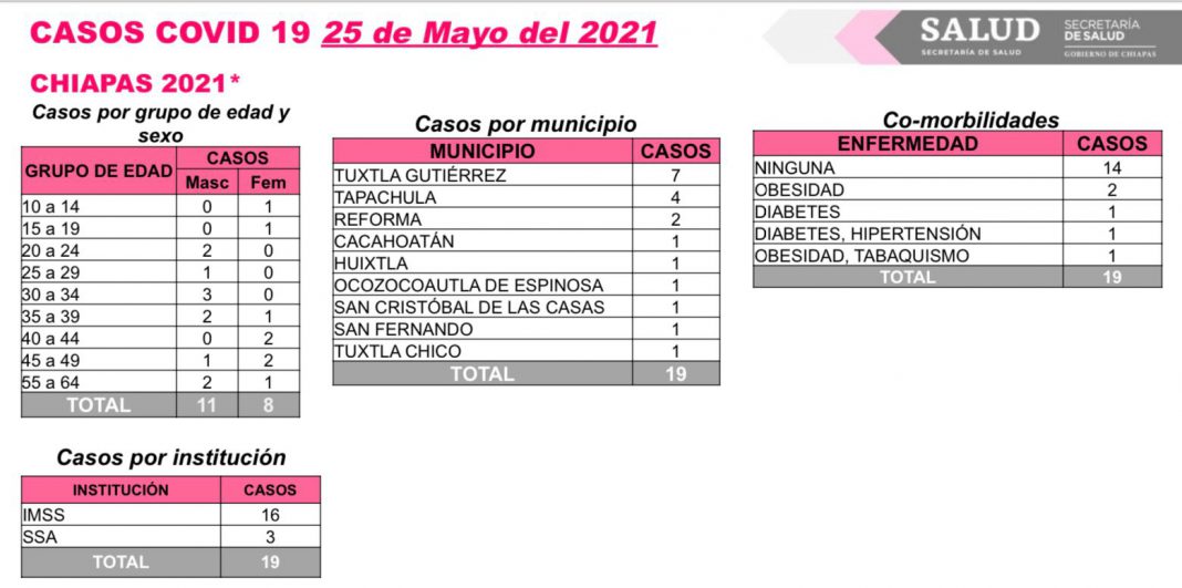 Tuxtla Gutiérrez, Chiapas; 25 de mayo de 2021.- En las últimas horas se notificaron 19 casos positivos de COVID-19, mientras que por segundo día consecutivo no se reportan defunciones, informa la Secretaría de Salud de Chiapas.