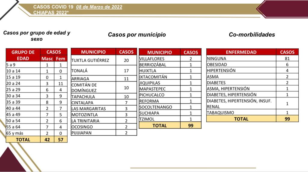 Tuxtla Gutiérrez, Chiapas; 08 de marzo de 2022.- En las últimas horas se registraron 99 casos positivos de COVID-19 en 22 municipios de Chiapas, que suma nueve días sin la ocurrencia de decesos, comunica la Secretaría de Salud del estado.