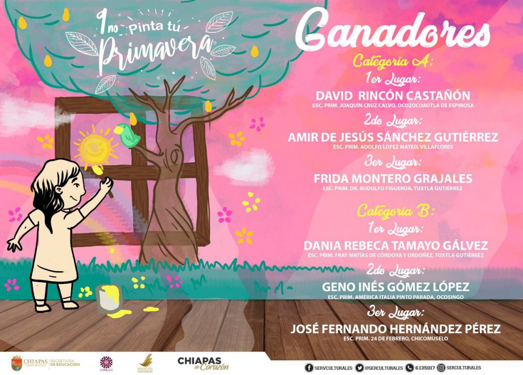 Tuxtla Gutiérrez, Chiapas.- La Secretaría de Educación, a través del Departamento de Servicios Culturales, perteneciente a la Coordinación de Programas Especiales y Compensatorios (Copeyco), dio a conocer los resultados de la novena edición del Concurso de Dibujo y Pintura Infantil “Pinta tu Primavera 2021”.