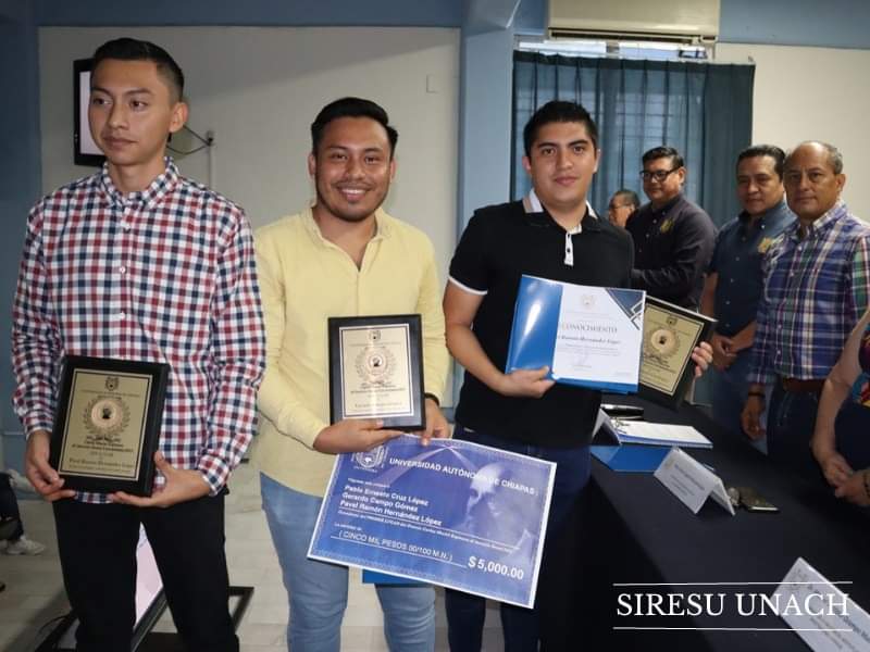 El primer lugar fueron para los alumnos de la Facultad de Arquitectura, Pablo Ernesto Cruz López, Gerardo Campos Gómez y Pavel Ramón Hernández López ganadores del 1er lugar con el Proyecto Construcción de viviendas por parte del programa CONAVI para los beneficiarios del municipio de Ixhuatán Chiapas.