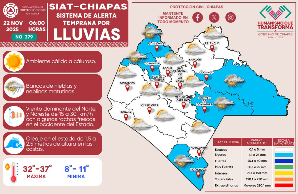 Hoy, 22 de noviembre de 2025, el Sistema de Alerta Temprana por #Lluvias (#SIAT) de #ProtecciónCivil Chiapas emite el pronóstico de lluvias en nuestro estado. 🌧