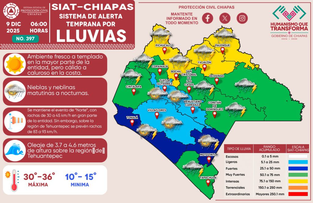 Hoy, 9 de diciembre de 2025, el Sistema de Alerta Temprana por #Lluvias (#SIAT) de #ProtecciónCivil Chiapas emite el pronóstico de lluvias en nuestro estado. 🌧⛈