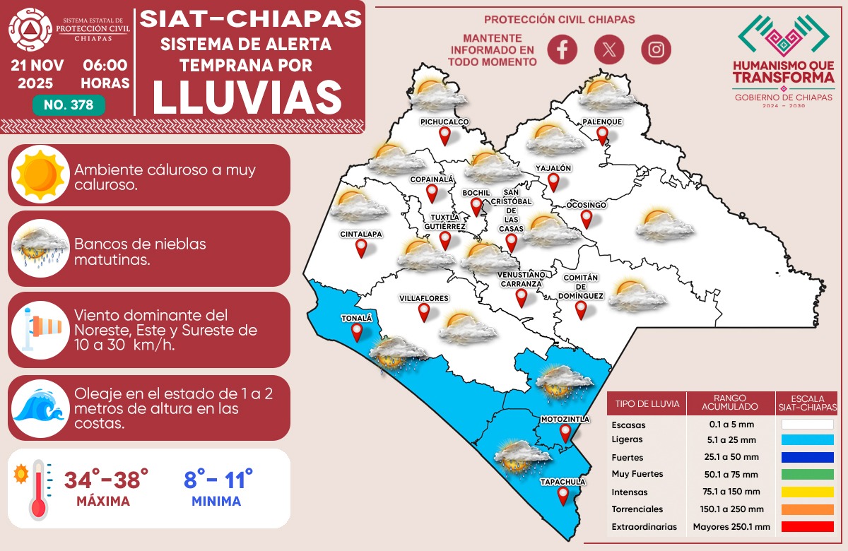 Hoy, 21 de noviembre de 2025, el Sistema de Alerta Temprana por #Lluvias (#SIAT) de #ProtecciónCivil Chiapas emite el pronóstico de lluvias en nuestro estado. 🌧⛈