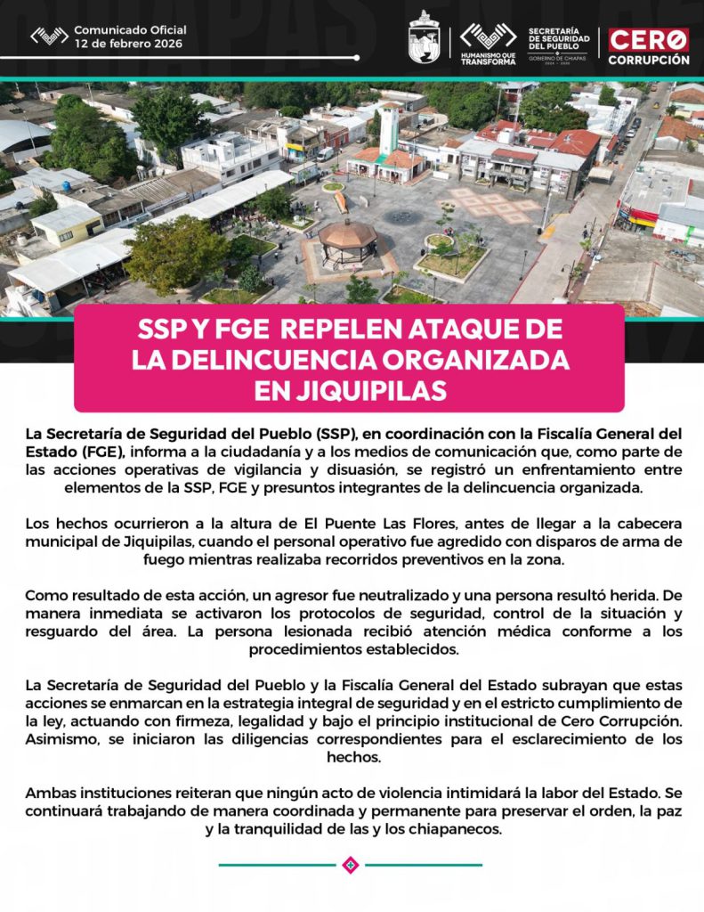 Jiquipilas, Chiapas, 12 de febrero de 2026.- La Secretaría de Seguridad del Pueblo (SSP), en coordinación con la Fiscalía General del Estado (FGE), informa a la ciudadanía y a los medios de comunicación que, como parte de las acciones operativas de vigilancia y disuasión, se registró un enfrentamiento entre elementos de la de la SSP, FGE y presuntos integrantes de la delincuencia organizada.
