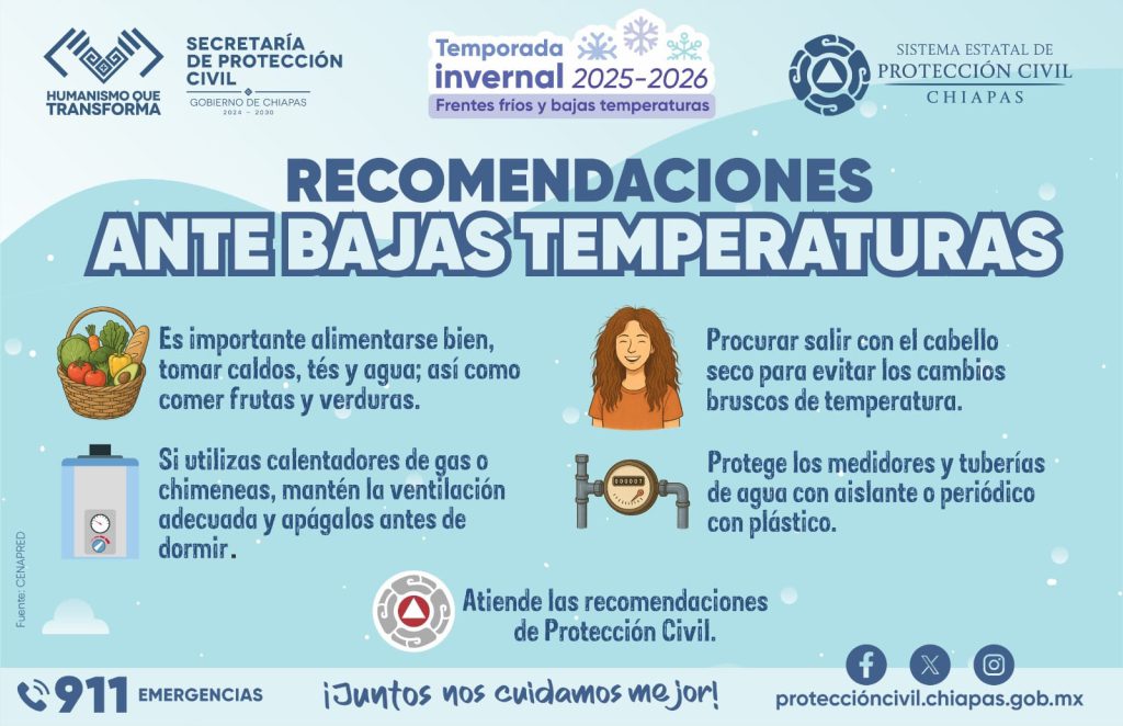 La Secretaría de Protección Civil Chiapas pide a la población tomar sus precauciones adecuadas en esta temporada invernal, con la finalidad de prevenir cualquier incidente y sobre todo, mantente pendiente de las recomendaciones de las autoridades de tu localidad. Cintalapanecos.com