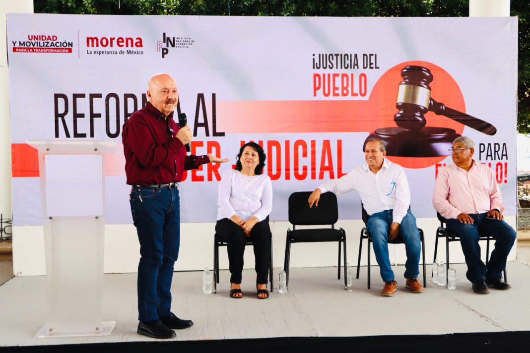 En la explanada del parque central, con la presencia de hombres y mujeres de este territorio, el legislador electo por Morena, Cruz Castellanos, acompañado del consejero estatal de Morena, Enrique Aguilar Martínez, destacó que de las 20 Reformas impulsadas por Andrés Manuel López Obrador, la que compete al Poder Judicial es una de las más complejas por todo lo que conlleva, pues se trata de devolver la confianza al pueblo donde los jueces, magistrados y ministros sean electos por las y los mexicanos, así como disminuir sus sueldos para alcanzar la justicia social.