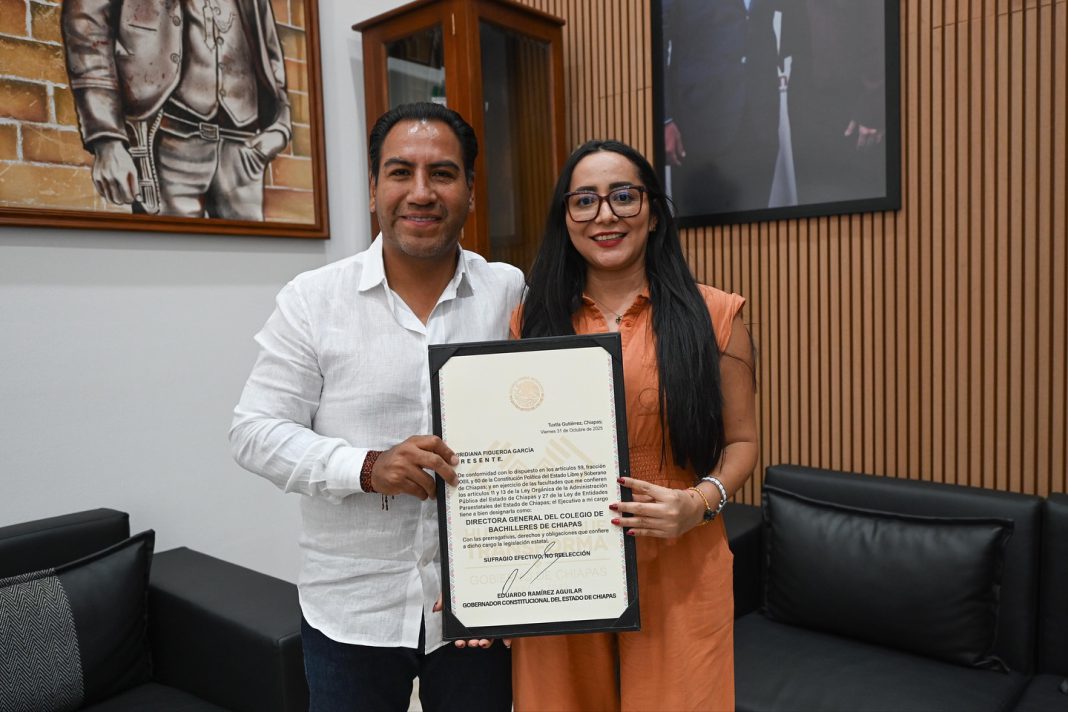 El gobernador del Estado de #Chiapas, Eduardo Ramírez Aguilar, tomó protesta a Viridiana Figueroa García como nueva Directora General del Colegio de Bachilleres de Chiapas y a Víctor Manuel Urbina Abadía como nuevo Oficial Mayor del Estado.