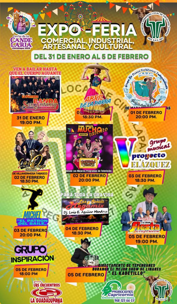 Vive la Expo-Feria Comercial, Industrial, Artesanal y Cultural en la Expo Ganadera de Cintalapa de Figueroa, como parte de la Feria de la Candelaria 2026.